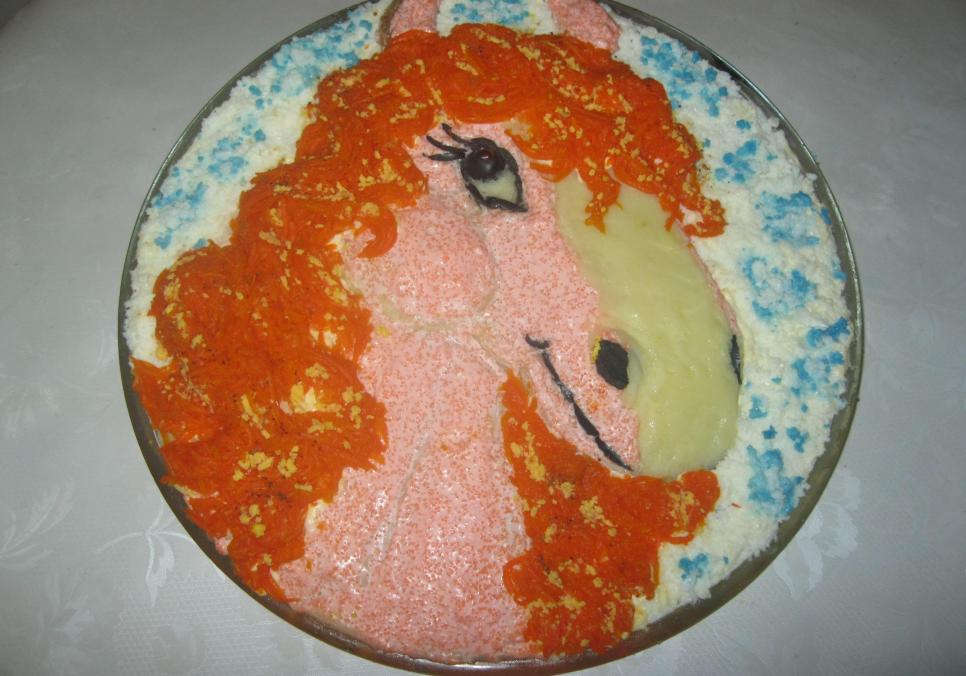 Намалювати на папері контур голови коня. Дивлячись на нього, викладати у великій тарілці новорічну закуску у формі Вогняного Коня з рудою гривою.Тарілку змастити майонезом і викласти з картопляного пюре голову коня. Потім покрити її шаром рожевої ікри, передню частину голови від чола до рота покрити тонким шаром картопляного пюре, а також задню частину голови та шиї коня. Зробити ножем чи ручкою від ложки впадини між головою і шиєю, а на шиї – дві впоперек і вздовж, як мускули. Також впадини для ока і смугу рота. Контур ока та вії викласти з тонких смужок маслини, в серединку – біле пюре та зіницю з половинки маслини. Ніздрі зробити з видовжених половинок маслин, рот викласти з маленьких смужечок маслини. Над головою викласти два вушка рожевого кольору. Відварену моркву натерти на корейській тертці довгими ниточками. Тепер прикрасити нашого красеня рудою гривою з натертої моркви, викладаючи її кучерявими хвилями на голові та шиї зверху, а також під головою, як з іншого боку. Так і здається, що зараз він стукне копитом і зірветься з місця, щоб принести нам перемогу і мир.Тарілку навколо голови викласти тертим білком, а потім трохи посипати білком, забарвленим соком капусти в блакитний колір. Закуска гарна, ще й смачна, картопляне пюре добре смакує із солоною рибною ікрою, а морква надає трохи солодкості.