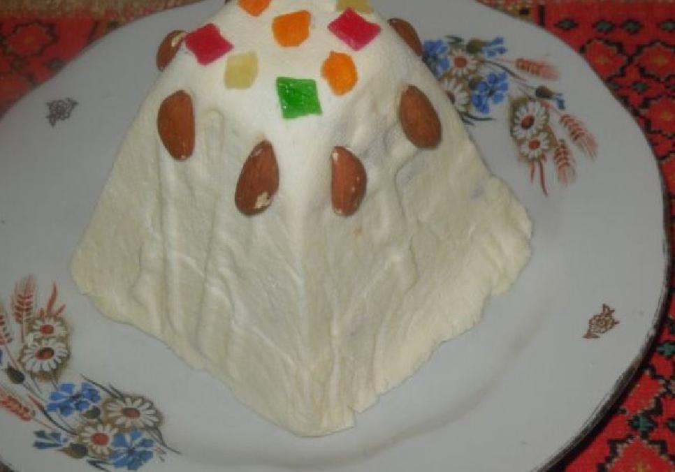400 г кисломолочного сиру, 8 курячих яєць, 70 г масла, 100 г цукру, 2 г ванільного цукру, 100 г родзинок або цукатів.