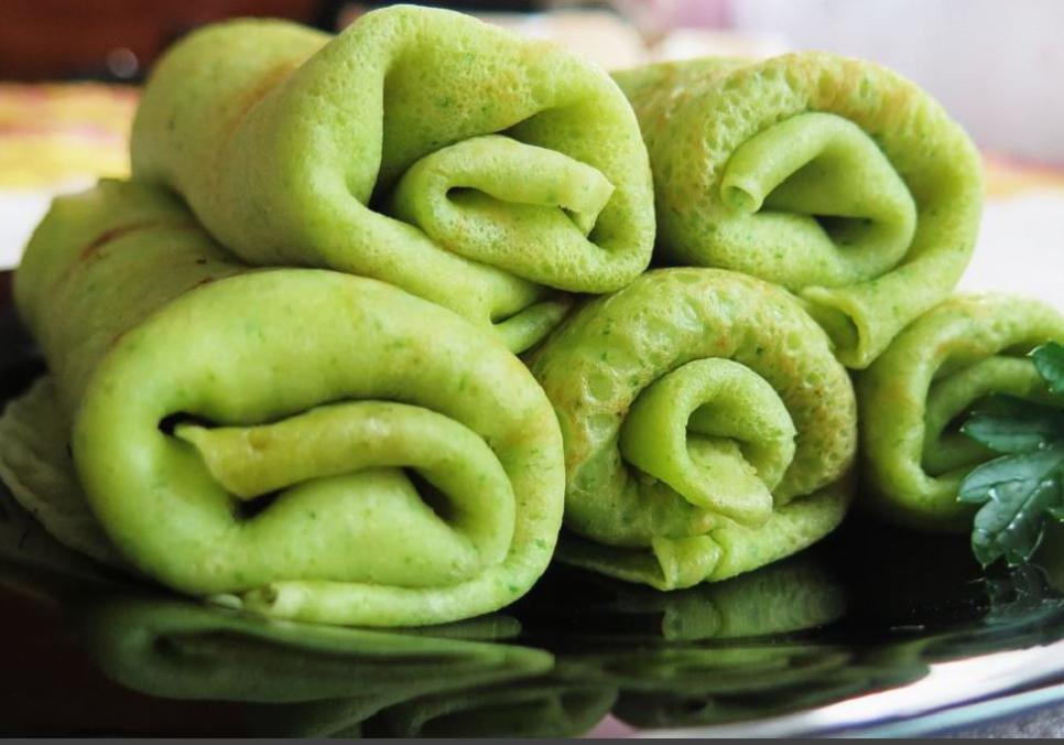 Шпинат помити, відрізати стебла. Подрібнити його в блендері, додавши олію. Замісити тісто: збити яйця, додати сіль, молоко, борошно і трохи шпинатного пюре. Тісто має бути злегка вʼязким, нагадувати за консистенцією пляшковий кефір. Розігріти сковорідку, змастити її маслом. Смажити млинці на помірному вогні по дві-три хвилини з кожного боку. На начинку плавлений сирок і твердий сир дрібно потерти, додати вичавлений часник і майонез, перемішати.