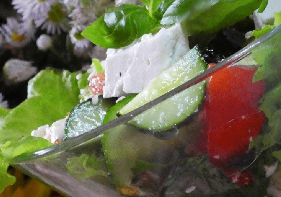 3 огірка, 3 помідори, 150 г домашнього кисломолочного сиру (краще спресований в одну велику грудку, а не розсипчастий), декілька гілочок базиліку, листя салату, кунжут (злегка підсмажений).