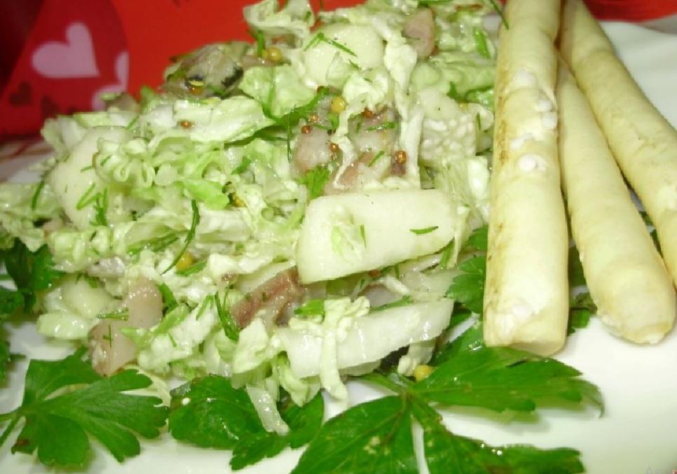 Оселедець почистити, відділити від кісток і нарізати середніми шматочками. Яблуко очистити від зернят і нарізати кубиками. Капусту посікти. Зелень помити і подрібнити. З’єднати всі продукти, полити заправкою і перемішати. Для заправки всі інгредієнти змішати. Салат подавати до картоплі або як самостійну страву.