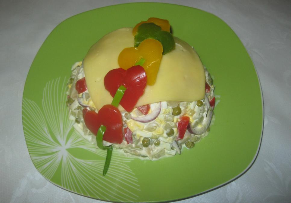 Куряче філе, корінь селери, яйця, червоний перець та огірки нарізати кубиками, додати зелений горошок, півкільця червоної цибулі, заправити невеликою кількістю домашнього майонезу. Приправити до смаку і викласти в салатник із круглим дном. Поставити в холодильник і залишити в ньому на дві-три години. Після цього перекинути посудину і викласти салат на тарілку. Сир потримати за кімнатної температури впродовж години, щоб він став пластичним, накрити цим плястерком сиру салатну гірку, притиснути до боків. З різнокольорових перчин вирізати формочками для печива або ножем «сердечка». В серединці кожного зробити отвір, нанизати їх на довге стебло зеленої цибулі й викласти на сирний «капелюшок». Красиво і смачно!