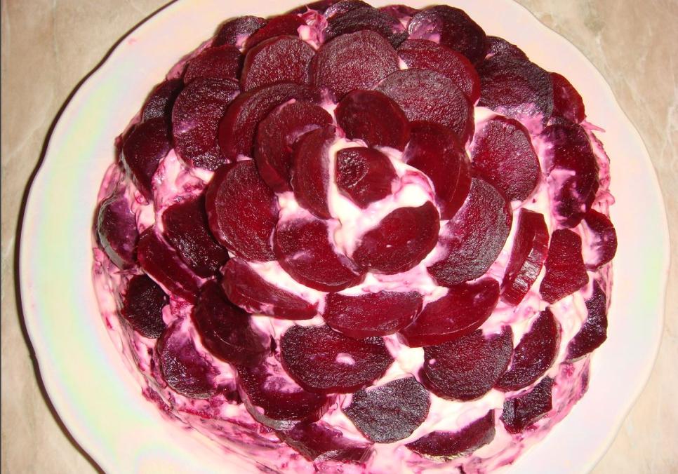 Філе оселедця нарізати кубиками. Цибулю дрібно покришити. Кальмари й овочі відварити. Один буряк залишити для прикрашання, а всі інші продукти нарізати маленькими кубиками. Заправити салат майонезом та викласти гіркою у пласку тарілку. Буряк нарізати тонкими півкільцями і від центру салату гарно викласти ними «пелюстки» «троянди». Красиво і смачно!