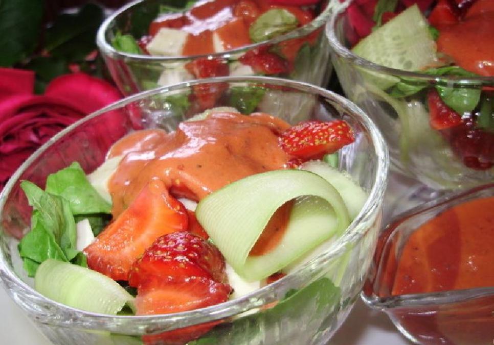 Для полуничного соусу: 10-12 ягід полуниці, 3 ст. л. оливкової олії, 1 ст. л. бальзамічного соусу (або бальзамічного оцту), сіль, цукор, перець за смаком.