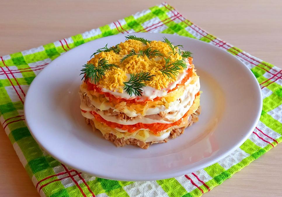 Салат «Мімоза» з тунцем та маринованою цибулею