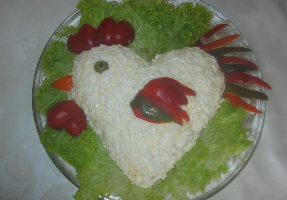 Серце зварити у воді, поклавши в неї цибулину та морквину, посолити, поперчити. Змолоти його разом із морквою у м’ясорубці, приправити до смаку, додати дві столові ложки майонезу і перемішати. Картоплю почистити і подрібнити на тертці зі середніми вічками, змішати з посіченим кропом та столовою ложкою майонезу. Плавлений сирок дрібно натерти. Яєчні білки і жовтки окремо подрібнити на тертці зі середніми вічками.На тарілку покласти контур серця, вирізаний із паперу. Пошарово викласти інгредієнти, кожен шар, окрім сиру, змащувати майонезом: 1-й шар – мелене серце, утрамбувати поверхню ; 2-й шар – потерта картопля з кропом, приправлена спеціями ; 3-й шар – потертий жовток ; 4-й шар – плавлений сирок; 5-й шар – потертий білок. Зняти паперовий контур, за потреби підрівняти ножем краї салату. З цієї фігури зручно зробити «півника».З червоного перцю вирізати «гребінець» і «борідку», з жовтого перцю – «дзьоб». Прикріпити їх на лівій частині серця – це буде «голова». «Око» зробити з половинки оливки, «зіниця» – бутон гвоздики. З червоного та зеленого перцю вирізати «крила». У верхню праву частину серця встромити «хвіст», вирізаний із перчин різних кольорів. Довкола «півника» на тарілці розкласти листя салату.